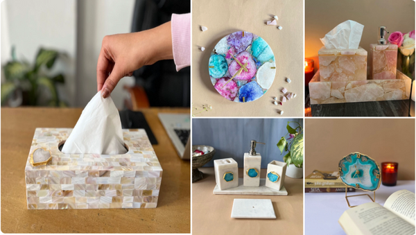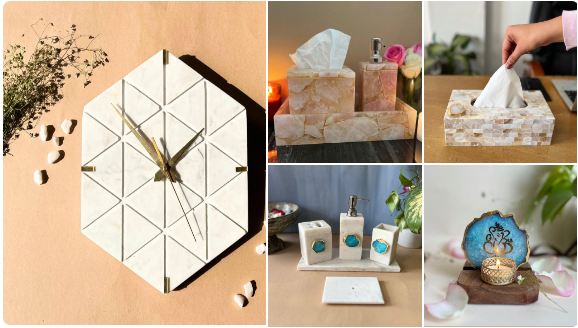 Such as wall hangings, candle holders, cutlery holders, desk clocks, wall clocks, pastry stands, tissue paper stands, coasters, napkin rings, cake stands, trays with agate, decorative plates, tealight holders, and table lamps. Choose from a wide range of the best home decor items.